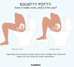 Sometimes repositioning on the toilet is helpful. The “Squatty Potty” position may work for you. With this illustration, you can see how a Squatty Potty® changes the angle of the rectum, making it easier to defecate.